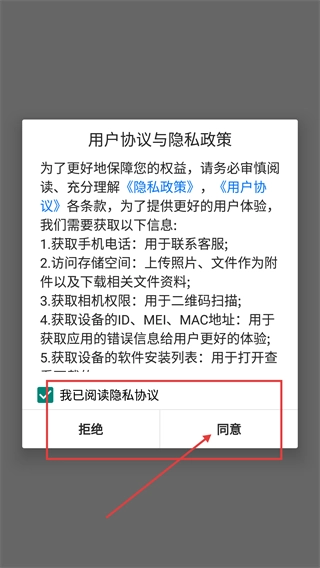 进入应用后会弹出【用户协议与隐私政策】的弹窗,在阅读相关条款后,勾选“我已阅读隐私协议”,再点击【同意】按钮。