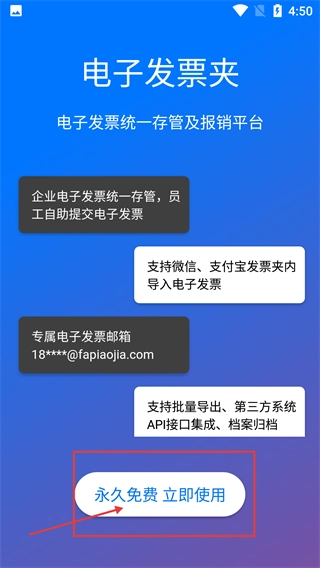 2、进入“电子发票夹”功能介绍页面(核心功能包括企业发票存管等),点击【永久 立即使用】按钮即可进入操作流程。