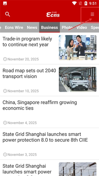 1、在【Ecns】的Business板块页面中,点击右上角的菜单按钮,展开功能选项,为后续操作做好准备。