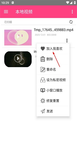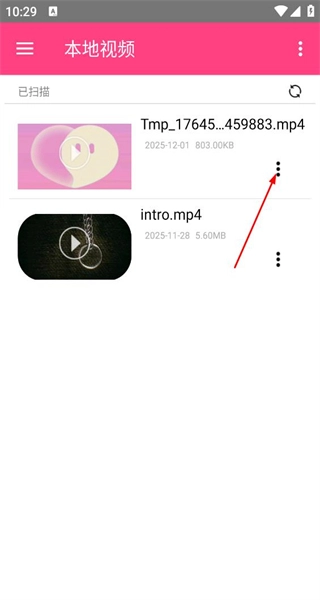 1、启动软件后,进入本地视频界面,浏览已扫描出的两个视频,点击第一个视频右侧的三点图标,为接下来的操作做准备。