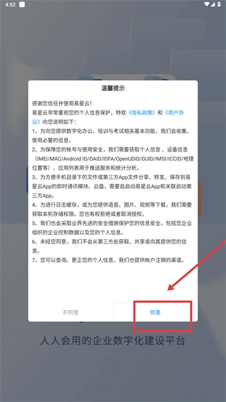 1、仔细阅读“易星云”的《隐私政策》与《用户协议》,确认无误后点击【同意】按钮,即可进入下一步操作流程。