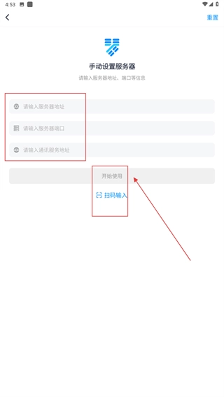4、进入手动设置服务器页面后,填写地址、端口等相关信息,也可选择【扫码输入】的方式,完成上述操作后点击【开始使用】按钮即可。