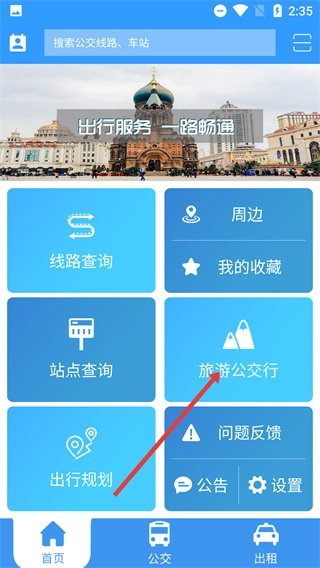 1、在【出行服务-一路畅通】页面中,可找到【旅游公交行】功能按钮,此页面同时包含【线路查询】【站点查询】等与出行相关的功能选项。