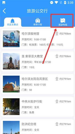 2、进入【旅游公交行】页面后,点击【旅游专线】标签,就能查看像【哈尔滨极地馆】这类景点的【开放时间】【门票】等详细信息。