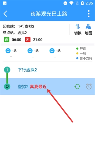 4、点击【夜游观光巴士】线路,进入详情页后,就能查看【起始站-终点站】【运营时间】以及【离我最近】的站点信息。