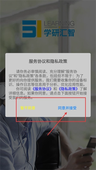 1、打开软件后,会出现【服务协议和隐私政策】的弹窗,仔细阅读相关条款后,点击【同意并接受】按钮,就能进入到后续的界面。