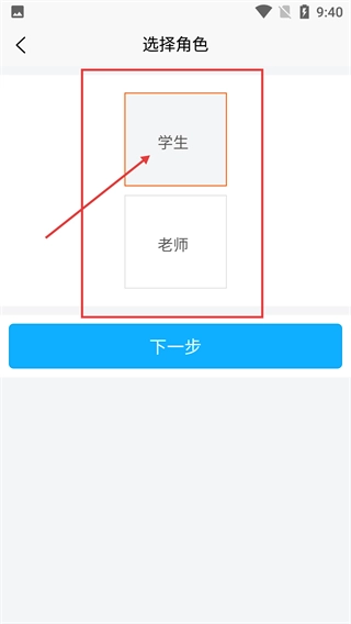 3、进入【选择角色】页面,先点击选中【学生】角色选项,接着点击下方的【下一步】按钮,继续完成注册流程。