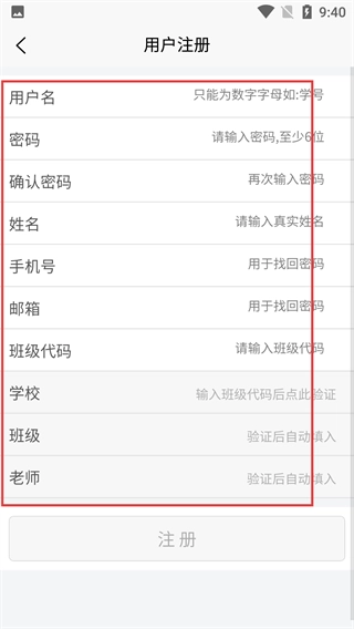 4、进入【用户注册】页面后,需填写【用户名】、【密码】、【姓名】等必填信息,只有完整填写这些信息,【注册】按钮才能被启用。