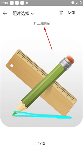 2. 进入照片选择界面后,根据提示对当前显示的文具类照片进行上滑操作,以此完成该张冗余照片的删除。