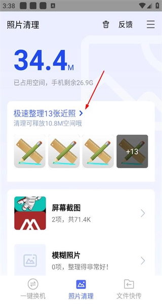 1. 启动软件后,进入照片清理界面,查看当前已占用的空间,接着选择“极速整理13张近照”的功能选项,即可进入对应的照片选择操作页面。