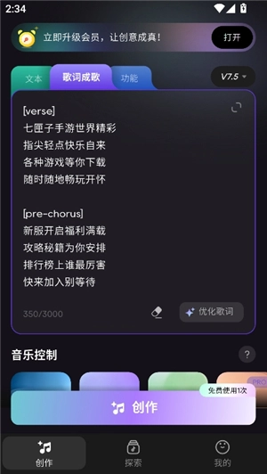 1、AI创作歌词:用户仅需输入主题或情感,AI即可生成对应的歌词,助力创作流程轻松开启。