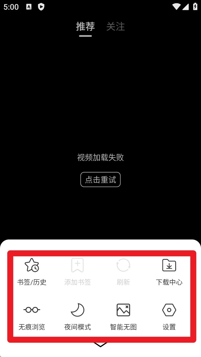 3.点击右下角即可打开菜单栏,其中包含夜间模式、无痕浏览、中心等辅助功能选项可供使用。