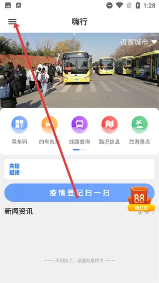 1、在“嗨行”首页点击左上角的菜单按钮,展开功能侧边栏,就能看到切换城市、资料编辑等功能选项。
