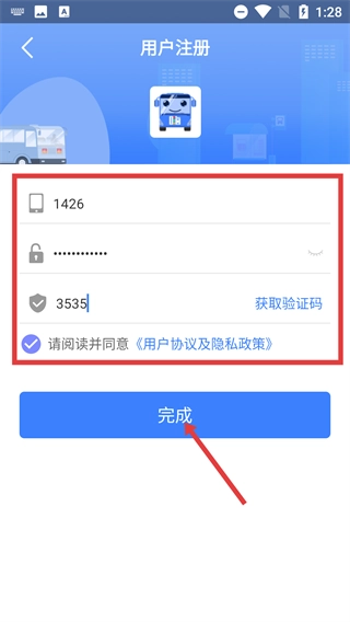 4、在用户注册页面填写账号、密码、验证码,并勾选《用户协议及隐私政策》后,点击【完成】按钮,即可完成“嗨行”账号的注册。
