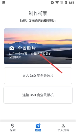 2、进入【创建】页面后,在【制作街景】界面,既可以选择【全景照片】拍摄,也能够【导入360度全景照片】,还可以【连接360度全景相机】。
