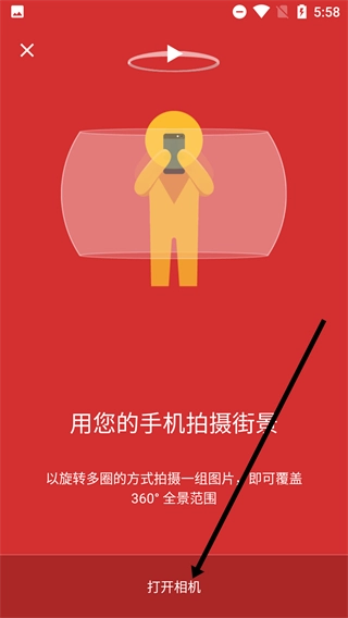3、选定拍摄选项后,屏幕会弹出【用您的拍摄街景】的提示,需要旋转多圈拍摄图片以覆盖【360°全景范围】,随后点击【打开相机】按钮即可启动拍摄。