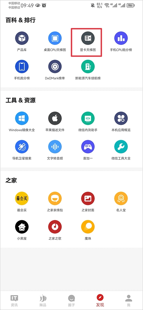 在发现页面里,平台为用户配备了百科排行、工具资源、之家这三大类功能板块,其中在百科排行板块中,用户可以点击进入显卡天梯图查看相关内容。