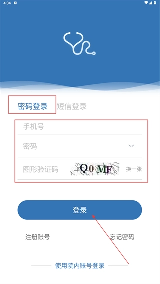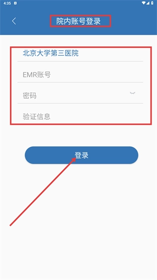 4、院内账号登录页面,填写对应医院的EMR账号、密码以及验证信息,点击【登录】按钮即可进入系统。