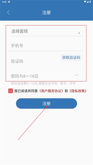3、注册环节需选择医院,填写相关号码与验证码,设置符合规范的密码,勾选协议后点击【注册】按钮提交信息。