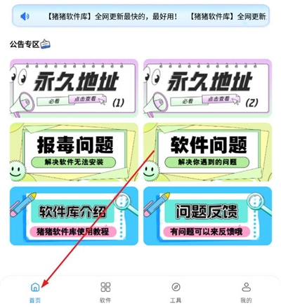 1、猪猪软件库划分有四大功能区,其主页面区域配备了通知栏,便于使用者查询固定域名以及了解程序相关动态;