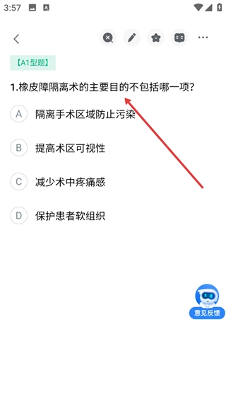 4、进入试题页面后,可作答【A1型题】类题目,比如“橡皮障隔离术的主要目的不包括哪一项?”,以此完成专业知识的练习。