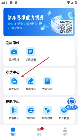 在临床思维能力提升平台的首页,找到【考试中心】板块,点击其下的【理论刷题】选项,即可进入考试题库界面。