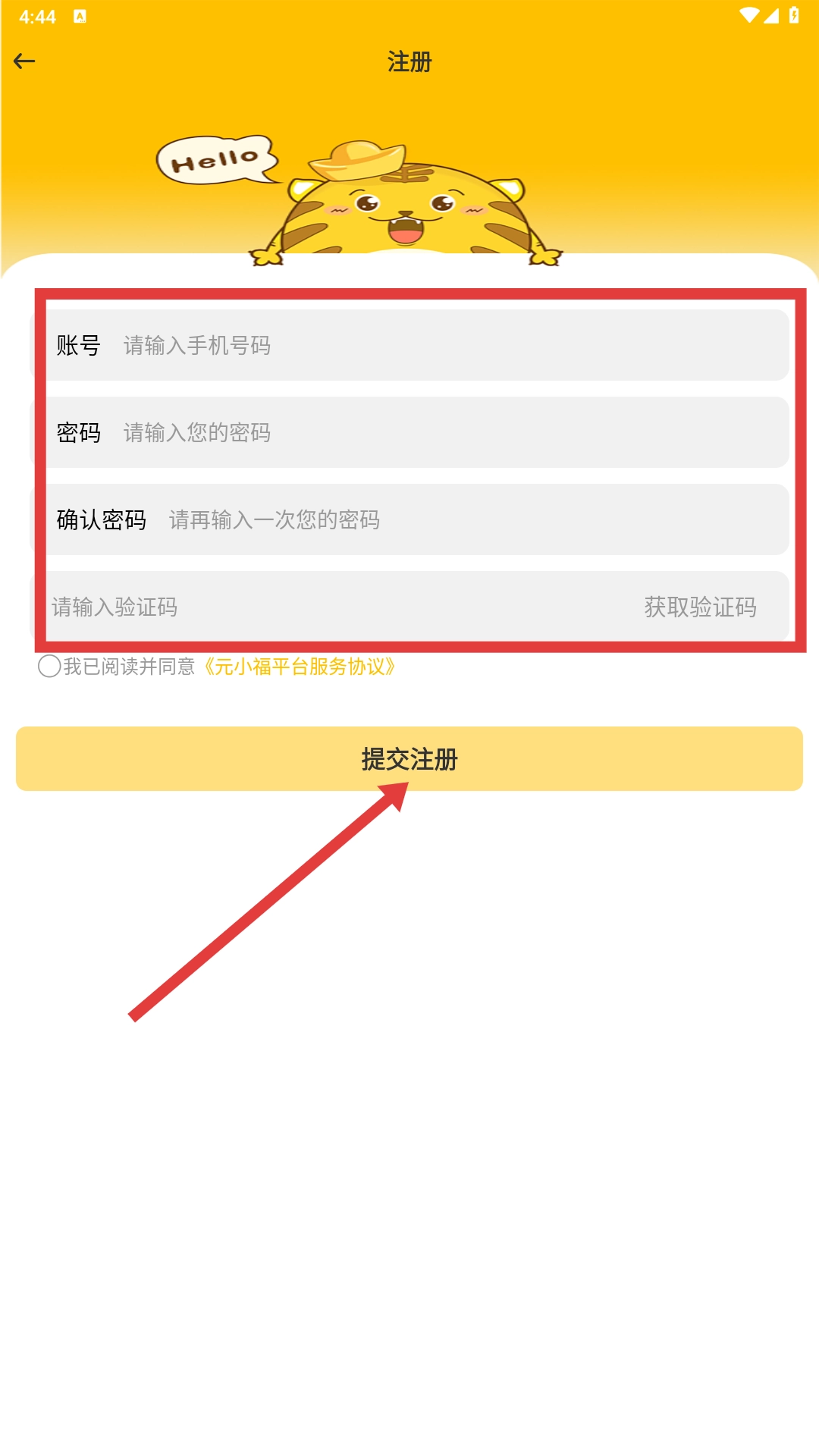 3、若需要进行注册操作,可在注册页面按顺序填写账号、密码和验证码,勾选相关协议后点击【提交注册】按钮,即可完成注册流程。