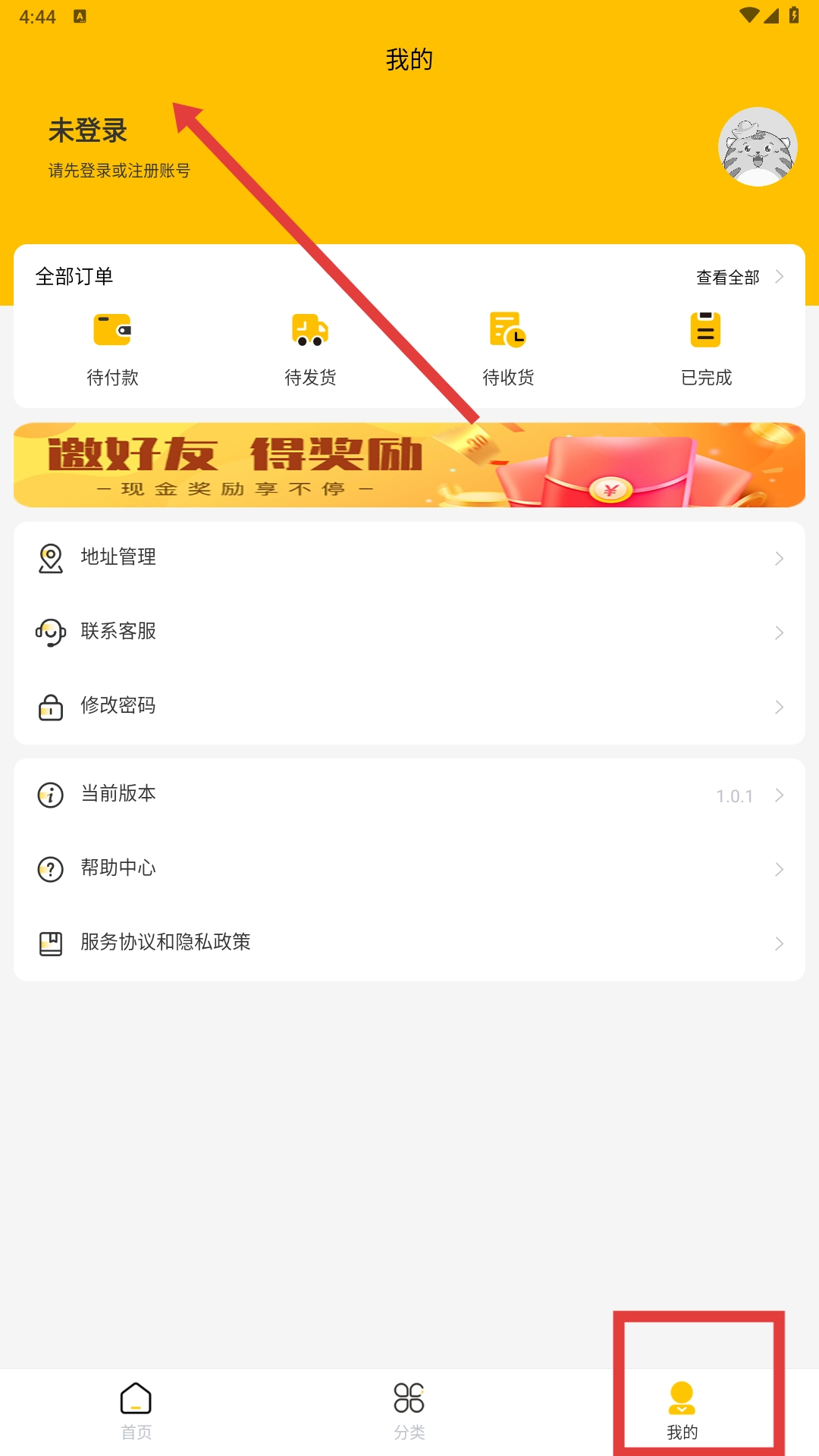 1、在【我的】页面,点击【未登录】提示区域,进入登录界面。