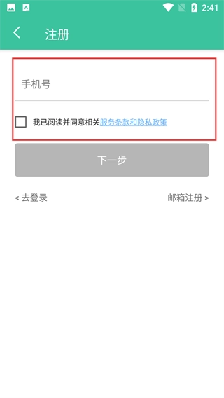 3、在注册页面,填写【号】并勾选【我已阅读并同意相关服务条款和隐私政策】,就能点击“下一步”按钮继续注册流程。