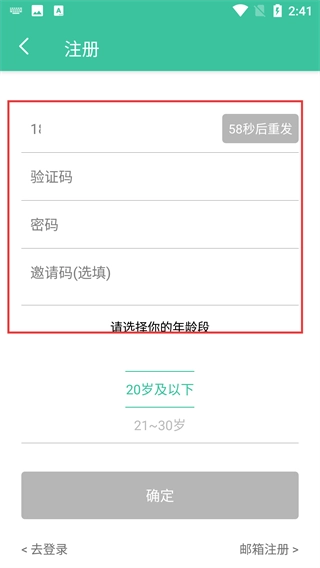 4、在注册流程里,要填写收到的验证码、设置密码,邀请码为选填项,还需选择年龄段,这些步骤完成后就能完成账户注册。