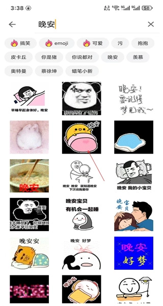 3、随后切换至晚安主题页面,该页面的表情包均与晚安相关,无论是自己使用还是发送给他人,都能找到合适的内容。