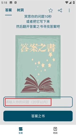 2、进入“答案之书”页面,在输入框中填写不超过20字的问题,以便获取相应的指引。
