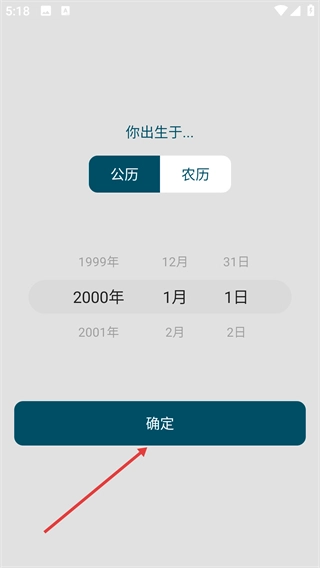 1、先选择出生日期所采用的历法类型(公历或农历),接着调整对应的年份、月份和日期,最后点击【确定】按钮,即可完成基础信息的设置。