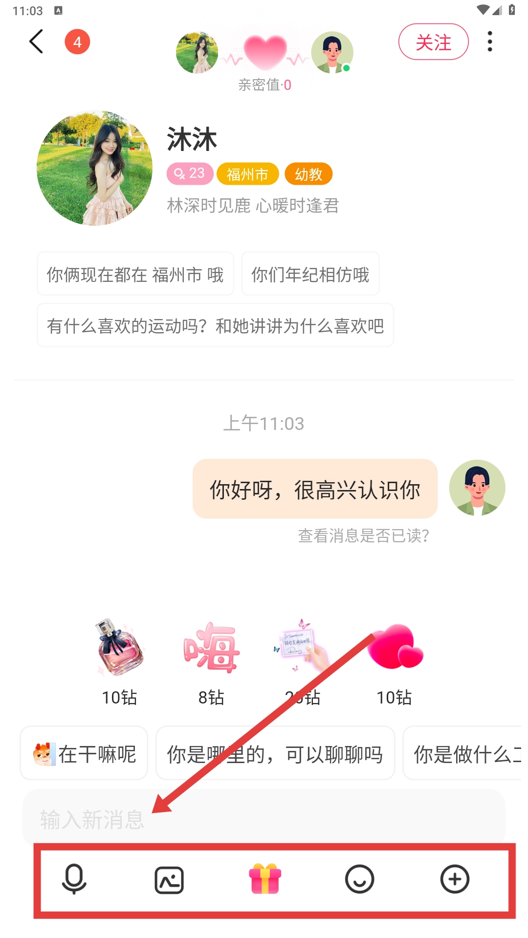 4、在聊天界面中,可借助底部功能栏里的输入框、语音、表情等功能,和对方开展沟通交流。
