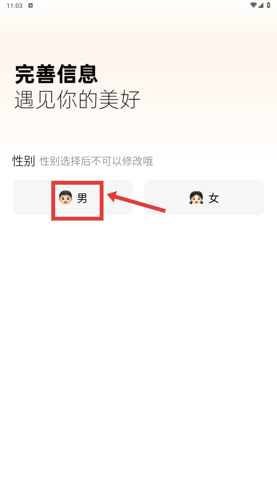 1、在“完善信息”页面,挑选性别(例如“男”),完成基础信息的配置,随后进入应用的主界面。