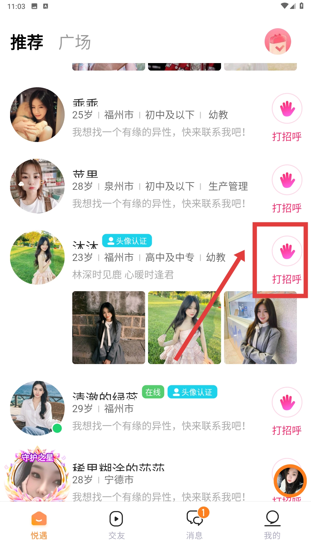 2、在推荐列表里,找到目标用户,点击其右侧的“打招呼”按钮,即可发起互动申请。