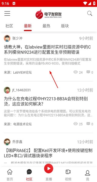 1、启动软件后,进入社区板块,这里会展示多条技术相关的帖子,接着浏览关于LabVIEW配置问题的帖子内容。