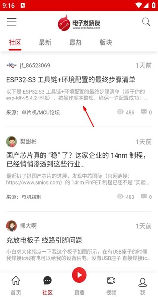 3、返回社区主板块,这里会呈现各类技术帖子,箭头所指的是ESP32配置帖,点击该箭头即可查看此帖子的具体内容。