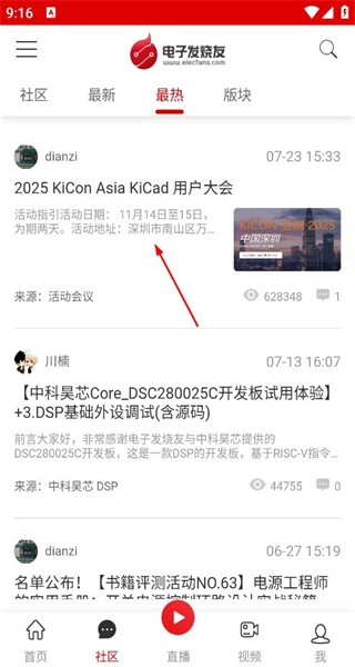 2、切换到社区热度最高的板块,呈现活动与技术相关内容,并查看KiCon Asia活动帖的详细信息。