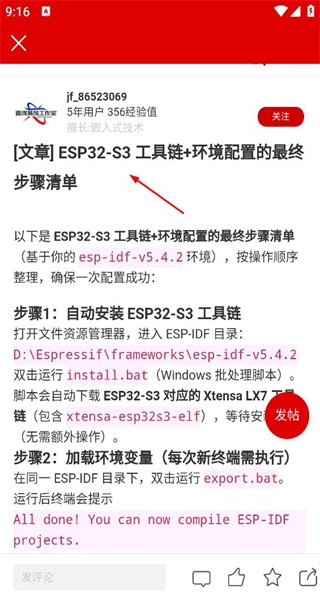 4、进入ESP32配置帖的详情页面后,文章会展示工具链的配置步骤,用户可以浏览该详情页的具体内容。