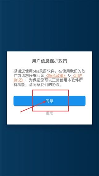 1、启动【obs录屏软件】后,会弹出【用户信息保护政策】的提示窗口,需要点击【同意】《隐私政策》,软件的所有功能才能正常使用。