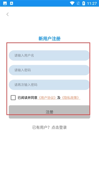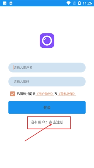2、进入软件登录页面后,需填写用户名与密码;若还未注册,可点击【没有用户?点击注册】按钮,开启注册流程。