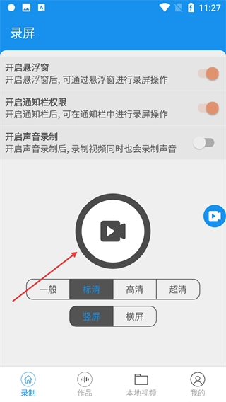 4、进入录屏设置页面后,能够开启【悬浮窗】【通知栏权限】【声音录制】等功能,还可以选择画质以及横竖屏模式,点击页面中间的录屏按钮就能启动录制操作。