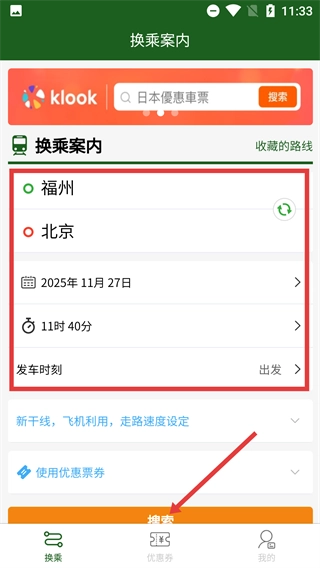 2、填写好【出发地】【目的地】等信息后,点击页面底部的【搜索】按钮,就能得到对应的换乘路线方案列表。