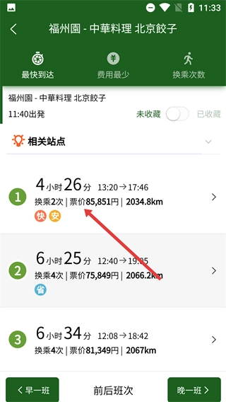 3、在换乘路线列表里,挑选目标方案(例如耗时4小时26分的路线),就能查看该方案的【换乘次数】【票价】等具体信息。