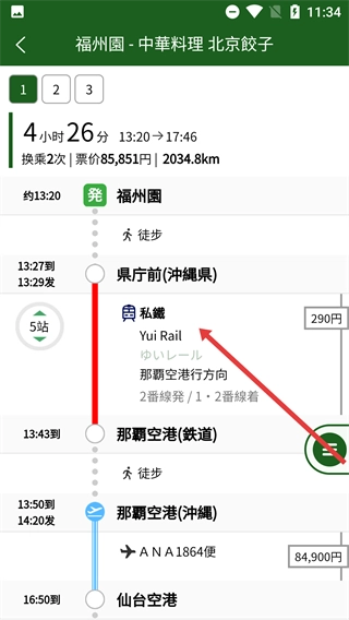 4、点击已选中的路线方案进入详情页面后,就能查看【步行】【私铁-Yui-Rail】等各段行程的具体安排了。