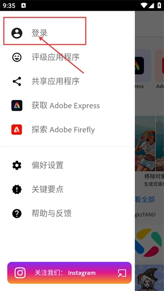 2、在展开的菜单里,点击【登录】选项,此菜单中还设有【评级应用程序】【共享应用程序】【获取-Adobe-Express】等功能选项。