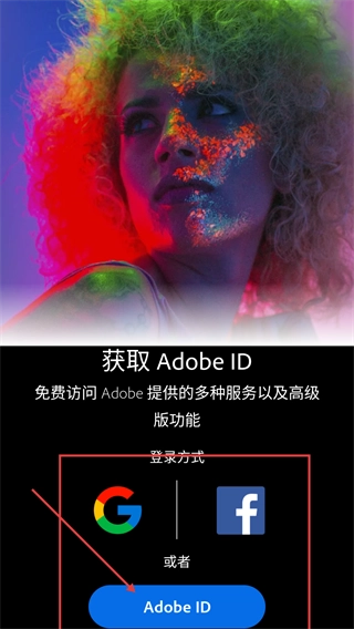 3、进入【获取-Adobe-ID】页面后,可选择通过【Google】【Facebook】或【Adobe-ID】进行登录,登录成功后即可访问Adobe提供的各类服务以及高级版功能。
