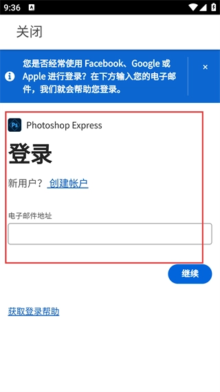 4、在【Photoshop-Express】的登录页面,新用户可以点击【创建帐户】按钮,输入电子邮件地址后,再点击【继续】按钮即可。
