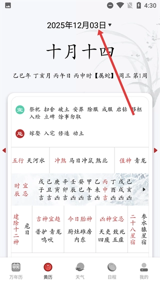 1、进入显示2025年12月日历的万年历界面后,点击底部功能栏里的【黄历】按钮,就能进入当天的黄历详情页面。